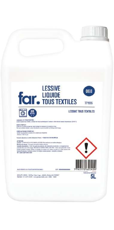 Lessive liquide tous textiles y compris les tissus synthétiques et couleurs. Active dès les basses températures (30°C à 40°C). Eaux douces et dures. Peut s’utiliser avec des doseurs automatiques. Agréablement parfumée : parfum fleuri