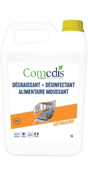 Nettoyant, dégraissant et désinfectant des sols, surfaces et matériel pouvant entrer en contact avec des denrées alimentaires. Convient pour éliminer toutes souillures grasses des sols, murs, plans de travail, chambres froides, équipements, ustensiles. Pouvoir moussant renforcé pour une utilisation en canon à mousse. Ne contient pas d’hypochlorite de soude.