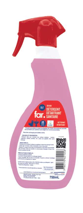 Nettoyant détartrant parfumé, idéal pour l’entretien des surfaces sanitaires : lavabos, baignoires, surfaces carrelées, WC. Laisse une agréable odeur après nettoyage
