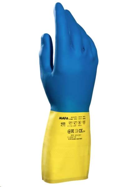 Gant étanche en latex naturel mixé néoprène (polychloroprène) de couleur bleu/jaune.