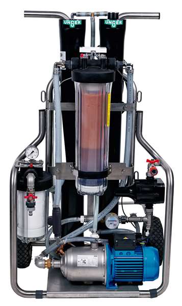Filtre à osmose inverse mobile avec une production d'eau pure élevée pour les grandes surfaces.~M~JAvec pré-filtre combiné (fines particules + chlore) et filtre en résine en aval.